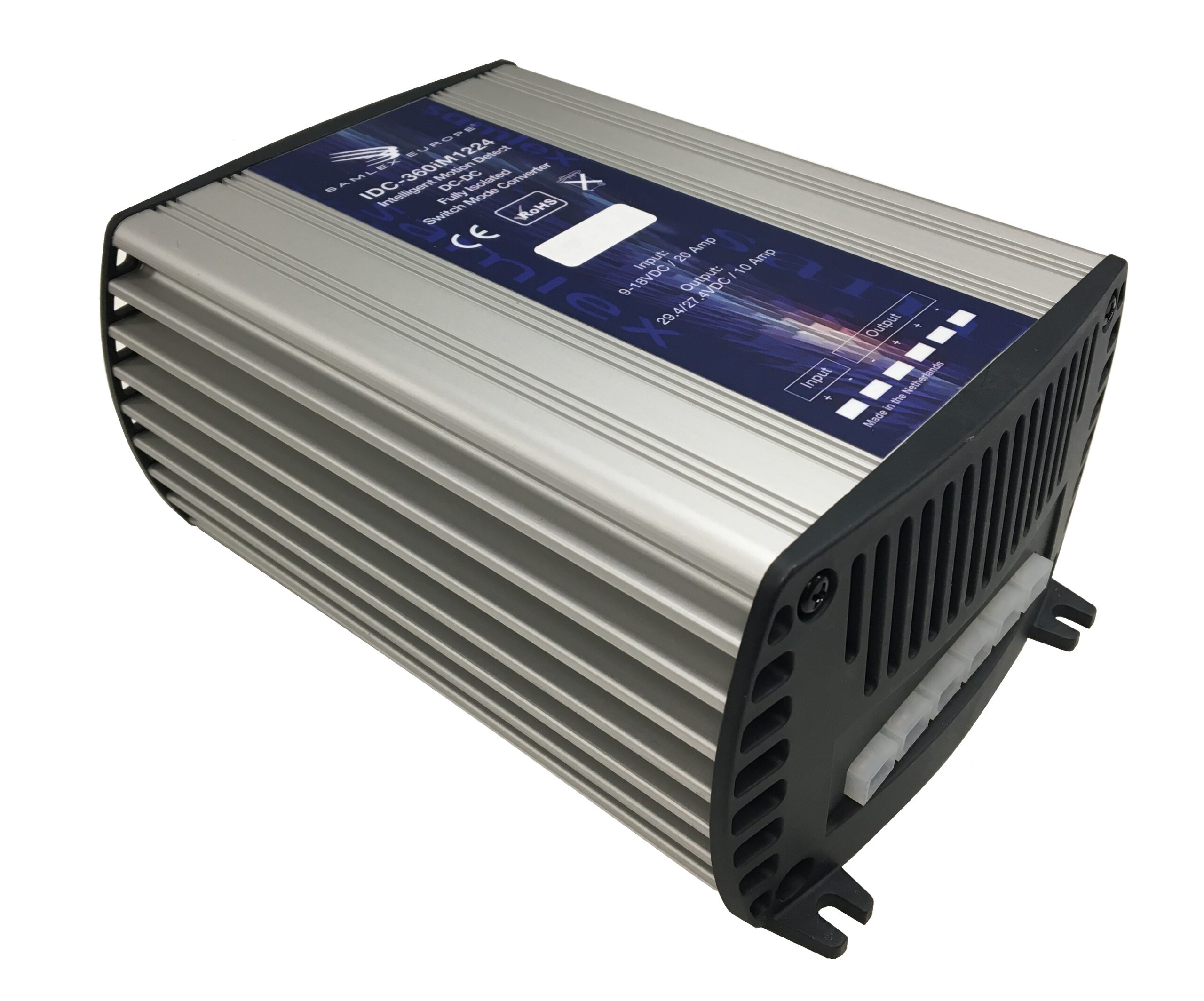 Die IDC-360-Serie ist eine komplette Reihe hocheffizienter isolierter DC-DC-Wandler mit 360 Watt, die für Anwendungen geeignet sind, die eine galvanische Trennung zwischen Eingang und Ausgang erfordern. Die IDC-360iM-Serie basiert auf den Standard IDC-360 Produkten, ist aber mit einer automatischen Batterieladefunktion ausgestattet. Dies ermöglicht es, eine am Ausgang angeschlossene Batterie von einer anderen, am Eingang angeschlossenen Batterie zu laden. Einer der Vorteile besteht darin, dass die Ladespannung der Eingangsbatterie nicht genau mit der Ladespannung der Ausgangsbatterie übereinstimmen muss, so dass zwei verschiedene Batterietypen miteinander verbunden werden können.) Zu den Merkmalen dieses isolierten DC-DC-Wandlers gehören ein kompaktes Gehäuse, eine Foldback-Strombegrenzung und ein Schutz gegen Kurzschluss, Überhitzung, Überspannung und Verpolung der Anschlüsse. Das Gerät wird mit 6,3 mm Flachstecker-Schnelltrennkupplungen geliefert. Der isolierte DC/DC-Wandler IDC-360A-24 ist EMI/EMC-konform und entspricht den europäischen Normen EN50081-1 (für EMI), EN50082-1 (für EMC) und der europäischen Automobilrichtlinie 95/54/CE.