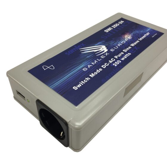 Dieser hocheffiziente DC-AC-Wechselrichter wandelt 12 Volt Gleichstrom in 250 Watt reine Sinus-Wechselstromleistung bei 230 Volt, 50 Hz um. Das Gerät ist mit einem modularen Batterieanschluss ausgestattet. Zu den Merkmalen gehören ein Überlastungsschutz (automatische Rückstellung), ein Alarm bei niedrigem Batteriestand und eine niedrige Leistungsaufnahme von weniger als 0,7 Ampere im Leerlauf. Die Stromversorgung erfolgt über eine einzelne europäische Standard-VDE-Steckdose und einen 5-V-USB-Ladeanschluss, der an der Vorderseite zugänglich ist.